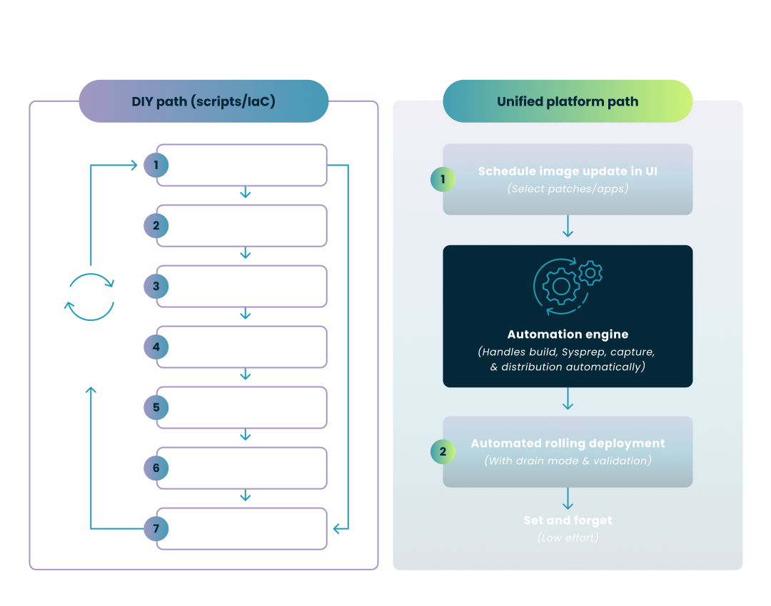 | Image Management | High Effort. Manual patching, sysprepping, and capturing. High risk of human error. | Complex. Automated via Azure Image Builder pipelines, but requires significant setup and code maintenance. | Automated & Simple. Schedule updates and backups via UI. Nerdio handles the build/distribute process in the background. |