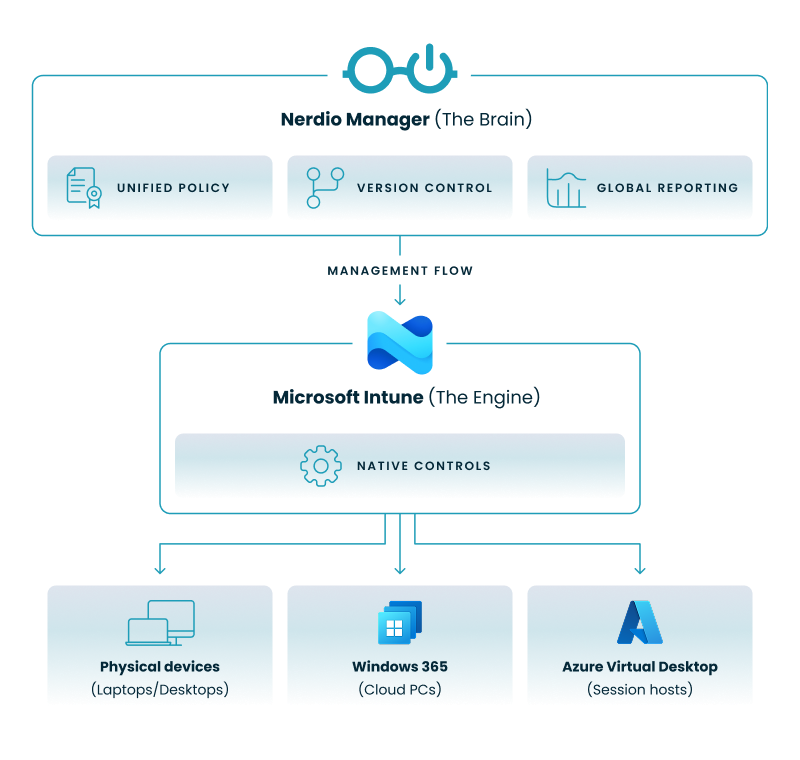 • The Middle Layer (Native Controls): Nerdio communicates instructions down to Microsoft Intune, leveraging the native Microsoft APIs to enforce your rules. This ensures you remain fully supported by Microsoft while gaining capabilities Intune doesn't offer natively.