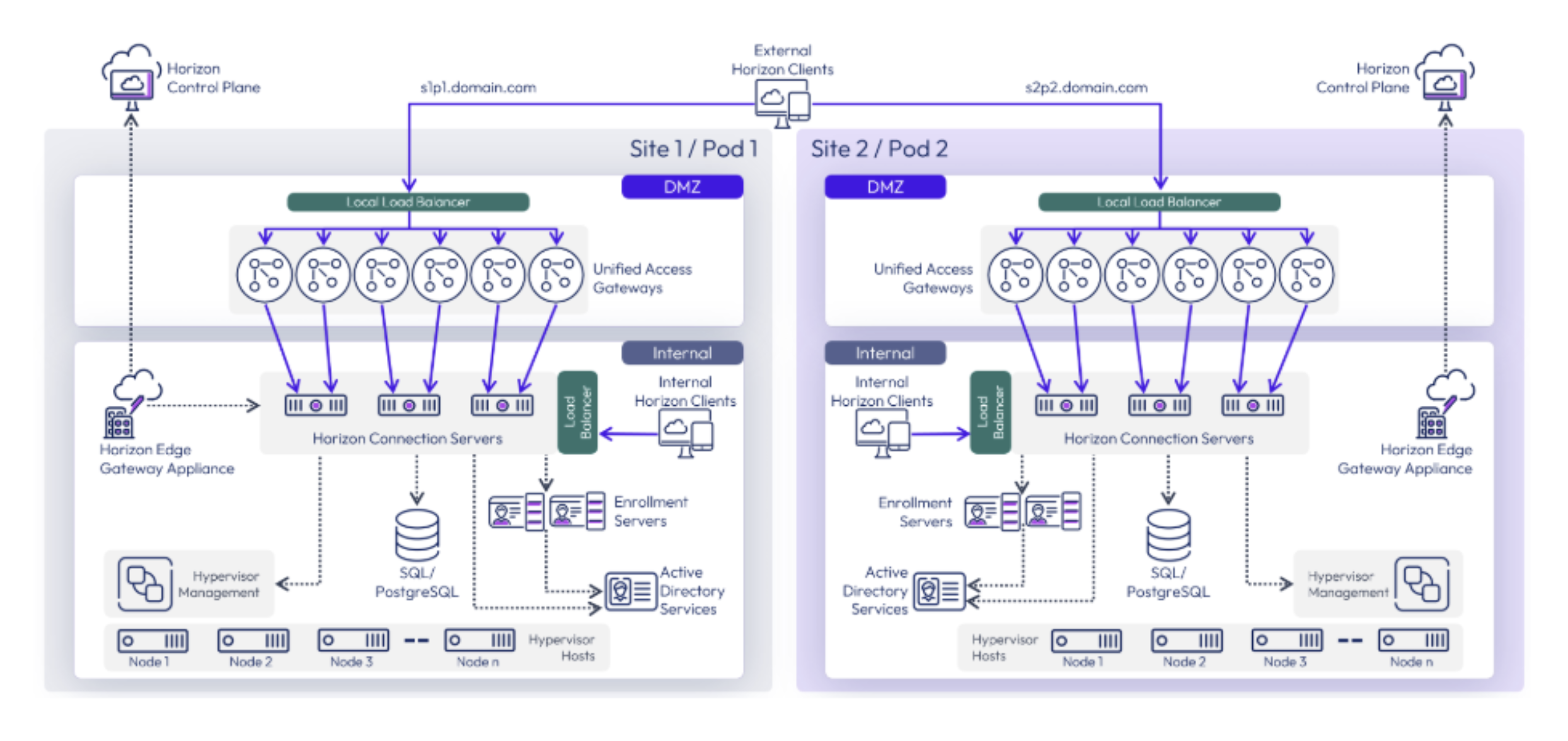 There are a variety of ways to deploy Omnissa Horizon across on-premises and cloud infrastructure with varying degrees of configurations based the type of desktop or application (Windows or Linux), physical or virtual, or infrastructure location (Horizon 8 on supported cloud platforms, including VMware Cloud on AWS, Azure VMware Solution, Google Cloud VMware Engine, Oracle Cloud VMware Solution, and Alibaba Cloud VMware Service). This image is simply to serve as a frame of reference based on a common deployment scenario.